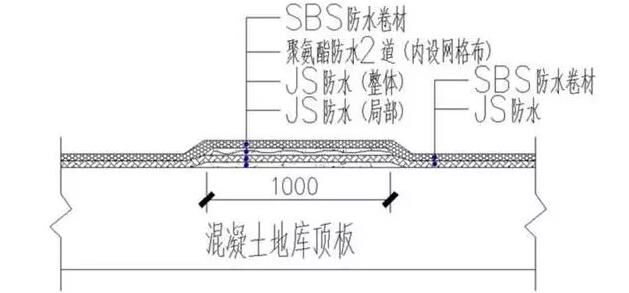 頂板混凝土養(yǎng)護后,冷縫處混凝土加強處理,設置防水附加層,為了保障地庫頂板防水效果,現(xiàn)場在冷縫處1m范圍進行防水附加層,具體做法如下: