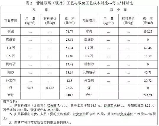 單單從混凝土原材料來看,“雙免”工藝比傳統“雙蒸”工藝高。如果考慮節省的燃料費用和“雙蒸”工藝的電力費用、人工工資支出差額,則“雙免”工藝比傳統“雙蒸”工藝可以節省成本7.59元/m3混凝土,而且完全滿足了環保要求。下表是成本分析對照表。