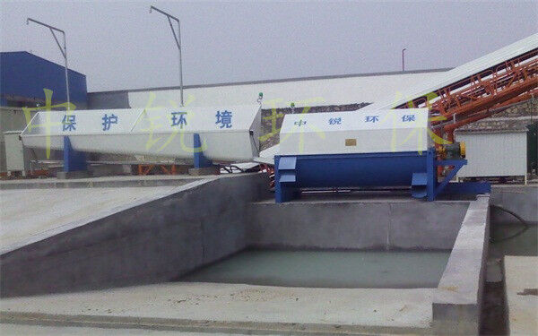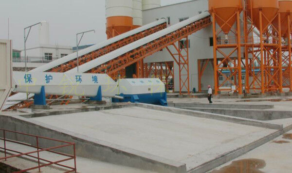 該系統(tǒng)主要由:攪拌車加水清洗裝置,溜槽輸送裝置,砂石漿水分離裝置,和泥漿水后處理裝置組成。混凝土輸送設(shè)備清洗后,將殘余混凝土排入溜槽中,在高壓水流沖擊下,經(jīng)溜槽進(jìn)入砂石分離機(jī),在不斷旋轉(zhuǎn)的分離機(jī)作用下,對(duì)混凝土進(jìn)行充分的清洗,同時(shí)將砂、石進(jìn)行分離,分離后的砂、石在導(dǎo)料葉片的作用下背向流動(dòng),再通過(guò)提升式出料口排出分離機(jī),分別堆放。清洗后的漿水從分離機(jī)的底部排出進(jìn)入沉淀池逐級(jí)沉淀后循環(huán)使用或進(jìn)入攪拌池回收利用。進(jìn)入攪拌池(一般情況2個(gè)攪拌池)的漿水為了防止沉淀凝固,需通過(guò)攪拌器的作用,攪拌器的工作為間歇式。分離出水泥漿在連續(xù)的攪拌器作用下,再通過(guò)高壓污水泵輸送到攪拌樓中待生產(chǎn)計(jì)量再利用。整個(gè)控制系統(tǒng)設(shè)有手動(dòng)和自動(dòng)控制,方便控制設(shè)置,整個(gè)系統(tǒng)運(yùn)行可靠,故障率低,維護(hù)量少等特點(diǎn)。