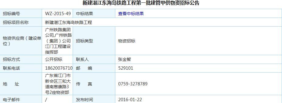 新建湛江東海島鐵路工程第一批建管甲供物資招標公告