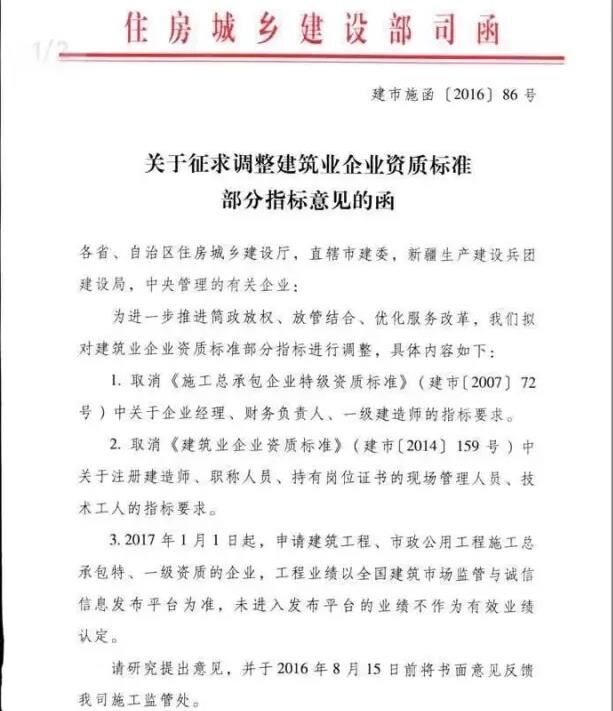 近日,住房和城鄉(xiāng)建設(shè)部建筑市場監(jiān)管司就“調(diào)整建筑業(yè)企業(yè)資質(zhì)標準部分指標”征求意見(建市施函[2016]86號),主要內(nèi)容有以下兩點: